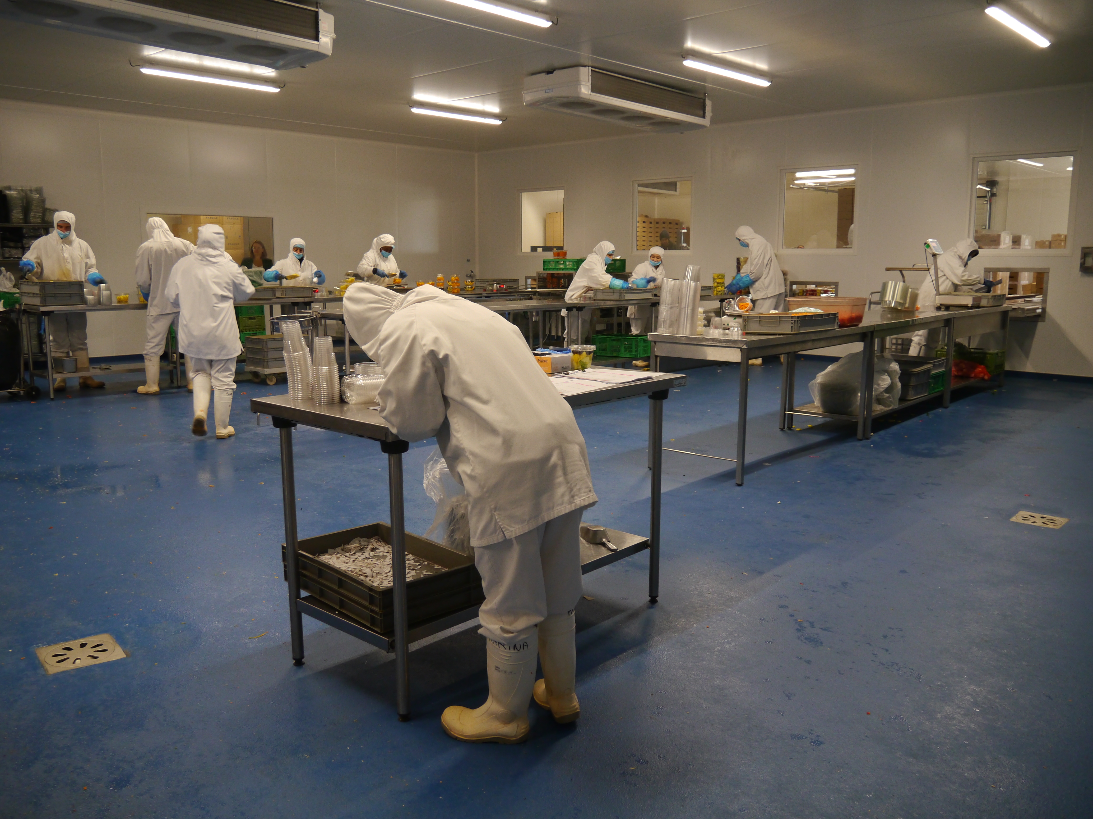 Afin d’avoir une hygiène irréprochable et un respect des produits, les préparateurs ont une tenue obligatoire, constituée de bottes, combinaison, charlotte, gants, masque …
